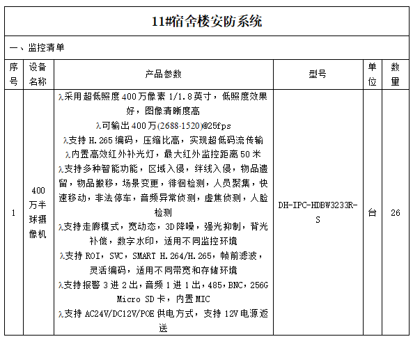 为迎接新生顺利入学,对11#宿舍楼安防系统进行改造升级,具体设备清单如下: