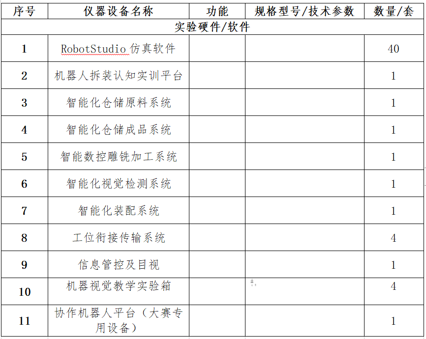 智能制造综合实验室是专业实验室,主要面向本校智能制造工程、智能机器人技术、智能控制技术等专业学生,承担《工业机器人技术及应用》、《自动化制造系统》、《智能生产计划管理》《智能制造项目实践》、《数字化工厂仿真》、《机器人视觉技术与应用》、《机器人机械基础与机构学》、《智能机器人编程与调试》、《智能生产数字化与仿真》、《自动生产线安装与调试》、《机器人工作夹具设计》、《智能机器人虚拟仿真技术》、《智能机器人编程与调试》等课程的基础性、综合性实验教学项目,锻炼学生对所学知识的综合应用能力。采购主要设备如下: