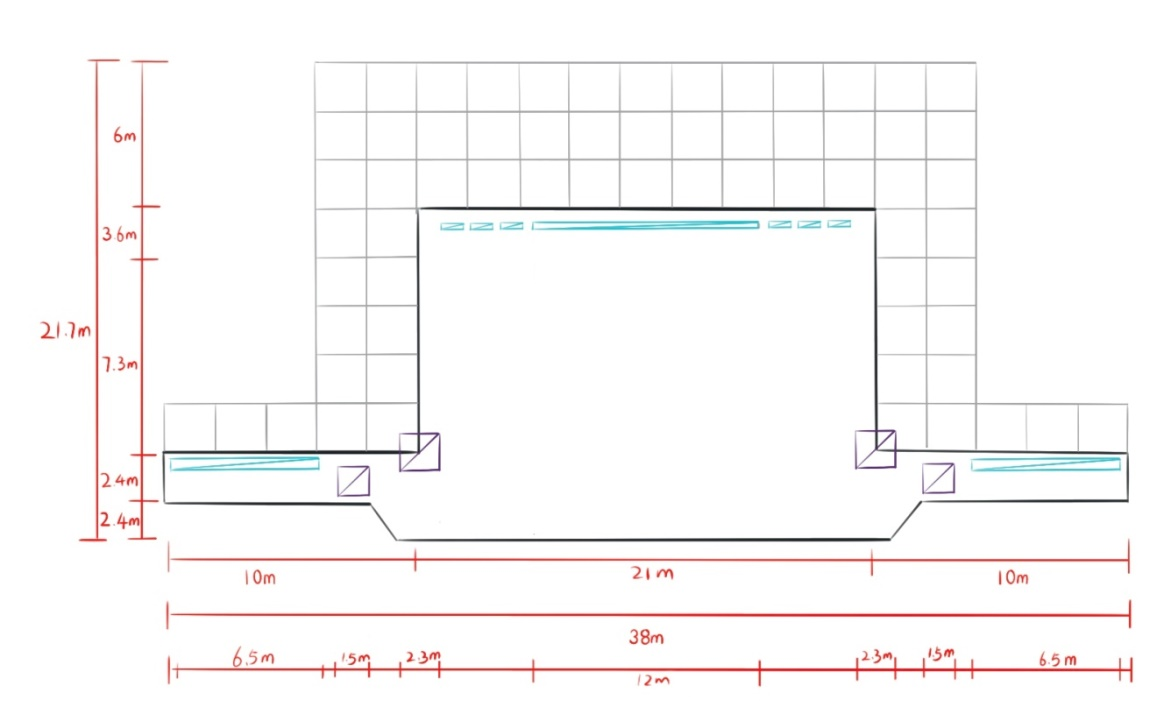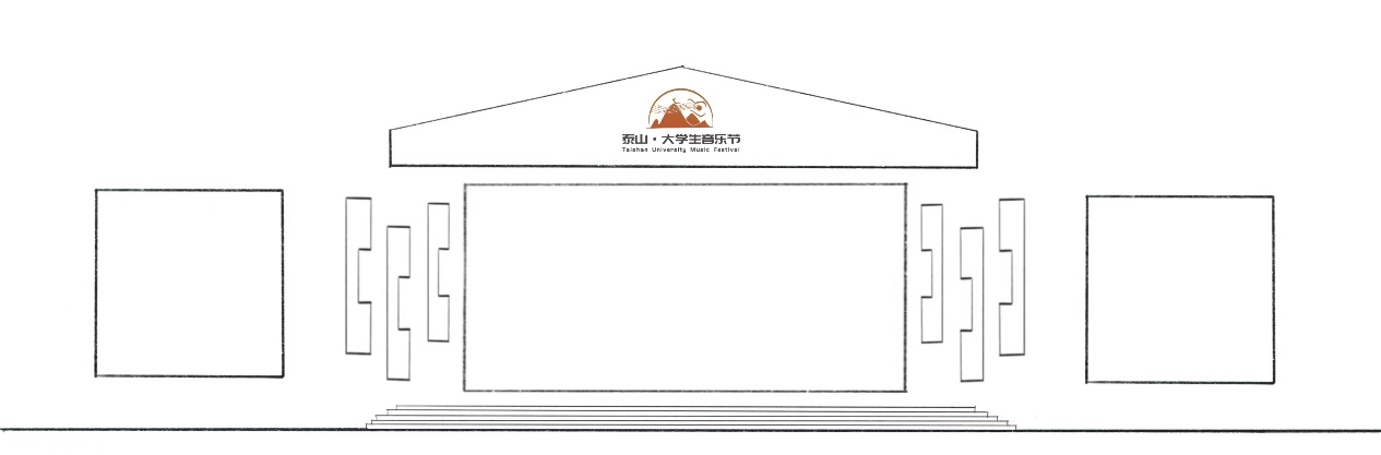 1、舞台尺寸:总舞台台宽38M深度10.9M高度15M,中央舞台台宽长21M深度15M高度15M,舞台两侧台宽各10M高度15M,附泰山·大学生音乐节舞台设计平面图。
